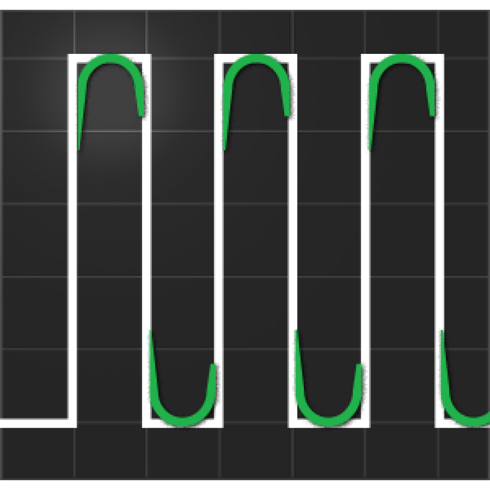 Также обратите внимание, что прямоугольный сигнал не влияет на время нарастания, и только углы перехода преобразуются в синусоиду. . Белая кривая — это линейный шум, представленный идеальной прямоугольной волной, а зеленая кривая показывает углы, переходящие в синусоиду с помощью Sparkz.