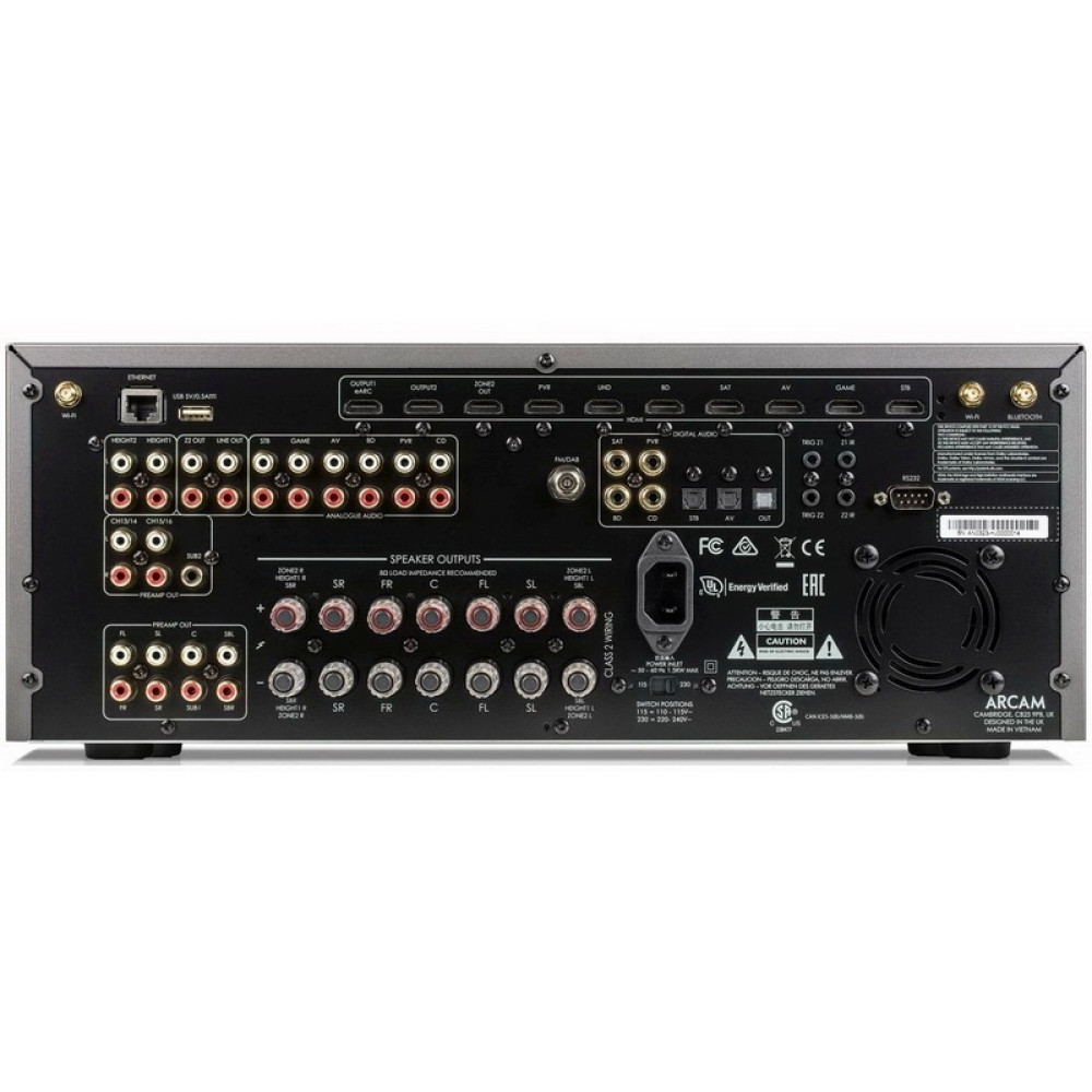 Для автокалибровки АС применяется прогрессивная система Dirac Live, которая использует микрофон, подсоединенный к компьютеру с установленным софтом Direct Live. При этом компьютер должен быть подключен к той же локальной сети, что и AV-ресивер. Arcam AVR20 получил 7 входов и 3 выхода HDMI 2.0a с поддержкой технологии HDCP 2.2, которая позволяет воспроизводить защищенный от копирования контент в разрешении Ultra HD. Один из HDMI-портов поддерживает функцию MHL для проигрывания HD-видео с мобильных устройств. Имеется широкий выбор цифровых и аналоговых входов, а также 7.2.4-канальный Pre Out (RCA). На тыльной панели установлен USB-порт для внешних накопителей, триггерные разъемы, интерфейс RS-232 и др. разъемы. Для подключения АС задействованы 7 пар винтовых клемм, две из которых можно использовать для зоны 2.