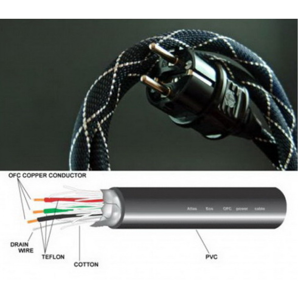 Силовой кабель Atlas Eos 4.0 состоит из проводников из меди OFC сечением 4,0 кв.мм в тефлоновой изоляции, заключенных в поливинилхлоридный рукав с тканевым покрытием. Благодаря экранированию алюминиевой фольгой и проводу заземления устраняются радиочастотные помехи, а скручивание проводников защищает от электромагнитных наводок. Силовые кабели Eos обеспечивают отличное звучание с расширенными басами. Кабель сечением 4.0 мм2 отличается более низким сопротивлением по сравнению с кабелем 2.0 мм2 и может выдерживать больший переменный ток.