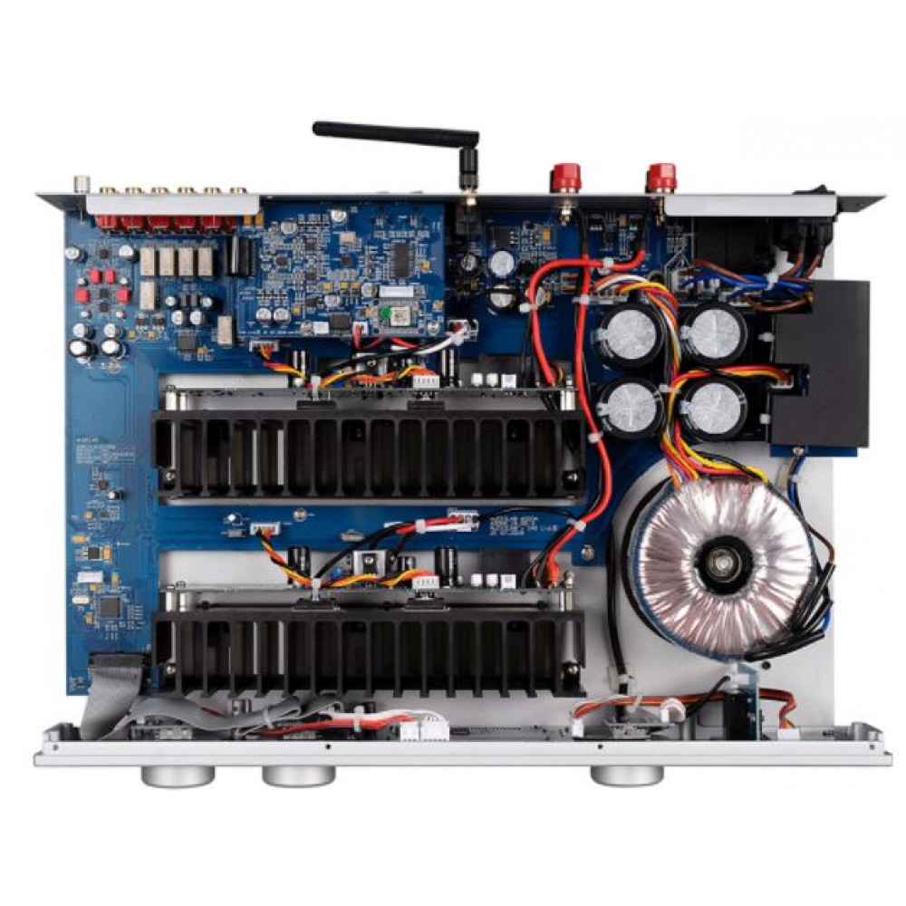 Мощный тороидальный трансформатор на 200 ВА, за которым следует резервуар емкостью 4x15000 мкФ (всего 60000 мкФ), помогает усилителю поддерживать жесткий контроль над музыкой, обеспечивая при этом отличный динамический диапазон.
