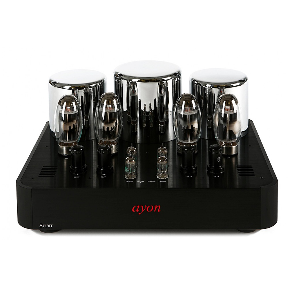 Ламповый усилитель мощности Spirit имеет переработанную топологию печатных плат, новую схему автоматической регулировки сеточных токов смещения, более мощный трансформатор, способный, помимо КТ88, KT120 поддерживать также KT150, и вдвое увеличенные номиналы конденсаторов в фильтре питания. Выходные лампы работают в триодном включении в чистом классе А либо в пентодном режиме в классе АВ; общая ООС отсутствует. Ayon Audio делает отчетливый акцент на аудиофильский подход, кратчайший путь сигнала, отобранные высококачественные пассивные элементы и пр. Детали вроде керамических гнезд под лампы с бериллиево-медными контактами, сделанных по спецзаказу, добавляют конструкции лоска. Также говорится о большом сдвоенном трансформаторе питания и о подведении к нитям накала выходных ламп стабилизированного постоянного напряжения с применением дроссельного фильтра.