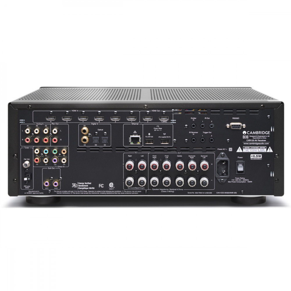 В блоке питания AV-ресивера Cambridge Audio CXR 120 установлен массивный тороидальный трансформатор, а конденсаторы фильтра имеют значительную суммарную мощность. Аппарат оснащен декодерами окружающего звука HD и обычных форматов имеет режим прямой подачи сигнала в обход вспомогательных схем. В дополнение к разъемам, расположенным на передней панели, CXR 120 оснащен семью HDMI входами и двумя выходами (один из которых поддерживает передачу сигнала в режиме возвратного аудиоканала). HDMI-коммутация обеспечивает передачу 3D и 4K сигналов. Также на задней панели CXR 120 находятся три линейных входа, два коаксиальных и два оптических, а также 7.1-канальный входы. К ресиверу можно подключить два сабвуфера, у него есть триггерные и ИК-выходы, интерфейс RS232. К двум USB-разъемам можно подключить опциональный Bluetooth-модуль BT100 и входящую в комплект Wi-Fi-антенну для беспроводного сетевого соединения.