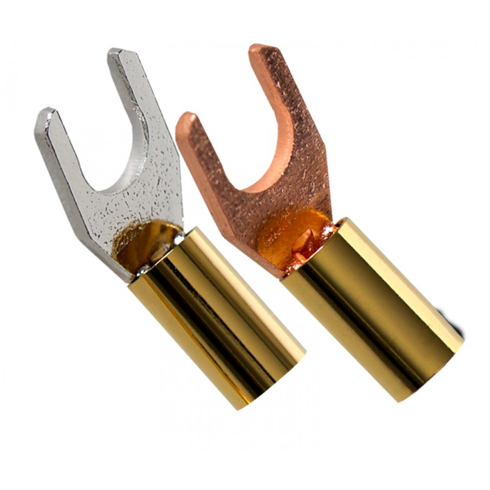 Двухсекционный штампованный разъем типа "лопатка" из чистой меди покрытой родием поверх серебра. Размер -  1/4"  Латунный кожух, позолоченный. Одно отверстие диаметром 2,5 мм для подключения кабеля.
