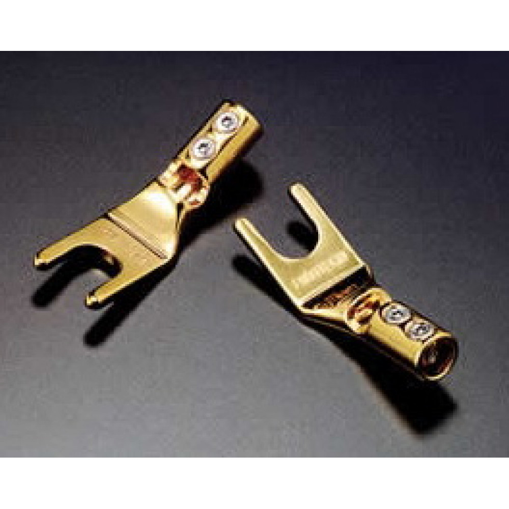 Медный сплав, специально обработанный по альфа технологии, (G) - покрытый золотом 24 карата . Под зажим или пайку акустического кабеля диаметром до 8.2 мм. Цена за 1шт.