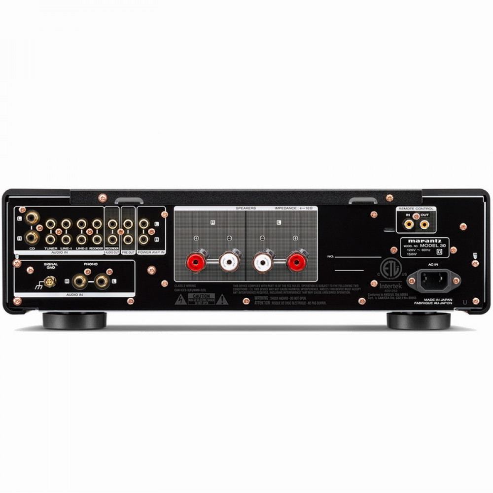 Кроме того, такая схемотехника обеспечивает необходимую устойчивость усилителя при работе с акустическими системами со сложной характеристикой импеданса. Регулятор громкости усилителя построен по новой схеме для достижения максимально плавной и точной настойки уровня сигнала без слышимых шумов. Блок питания Marantz Model 30 построен на базе мощного тороидального трансформатора с двойным экраном для полного исключения наводок на чувствительные аудиоцепи. В схеме нет конденсаторов связи, что также положительно сказывается на уровне искажений. На задней панели усилителя Marantz Model 30 находятся позолоченные RCA-гнезда для шести источников сигнала, регулируемый и нерегулируемый выходы, а также прямой вход для подачи сигнала на оконечник. Также здесь имеется две пары фирменных клемм для подключения акустики и разъем системной шины D-Bus.