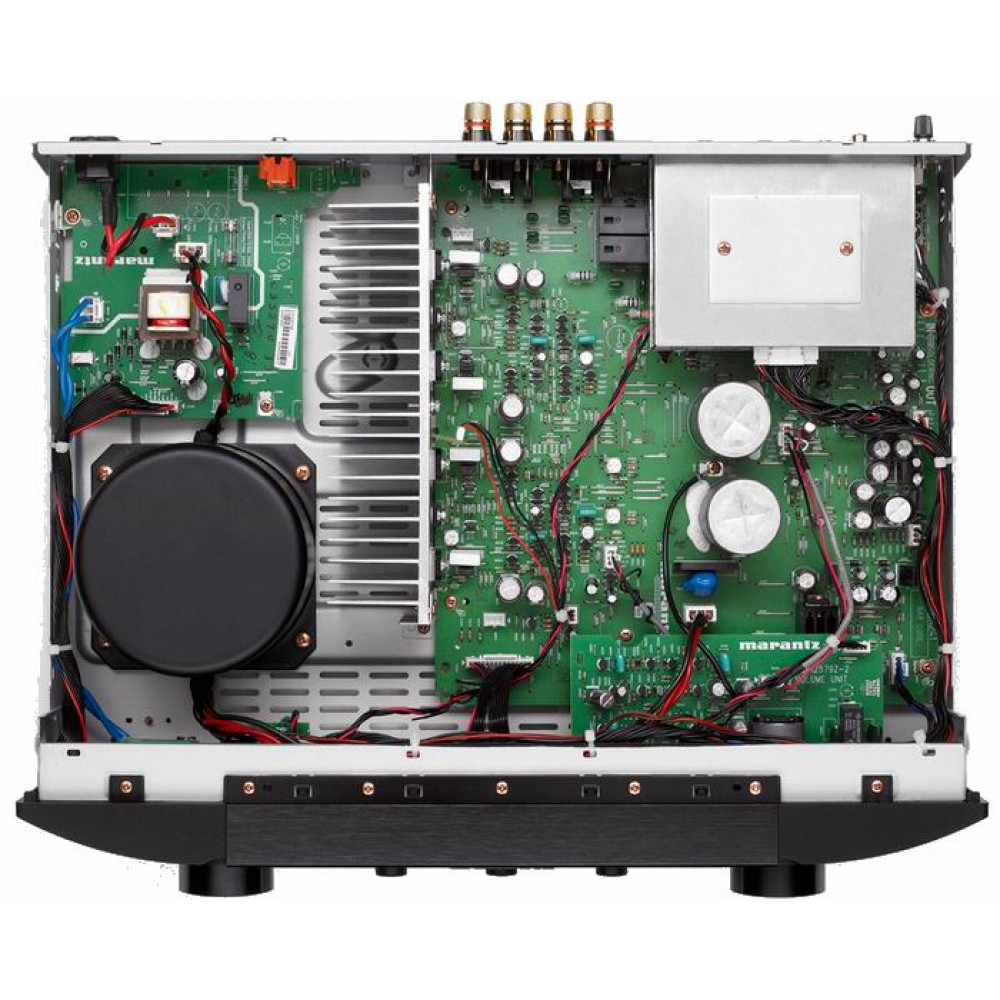 В результате инженерам компании удалось существенно расширить динамический и частотный диапазоны этого весьма удачного аппарата, сделав его звучание еще более привлекательным для меломанов. При этом функциональные возможности Marantz PM6006 остались прежними - он имеет качественный встроенный фонокорректор для MM-звукоснимателя, пять линейных входов, выходы для подключения двух записывающих устройств. Все линейный входы оснащены буферными схемами для снижения степени влияния соединительных кабелей на качество звука. На передней панели усилителя имеются органы управления всеми режимами его работы, включая регулировку тембра в области низких и высоких частот и стереобаланса, а также включения режима прямой подачи сигнала в обход вспомогательных схем. Marantz PM6006 оснащен отключаемой схемой тонкомпенсации для улучшения качества звучания аудиосистемы при прослушивании на малой громкости. К усилителю можно подключить две пары АС, а на его передней панели имеется разъем для подсоединения наушников. Также Marantz PM6006 оснащен входом и выходом для подключения фирменной системы управления, и комплектуется пультом ДУ.