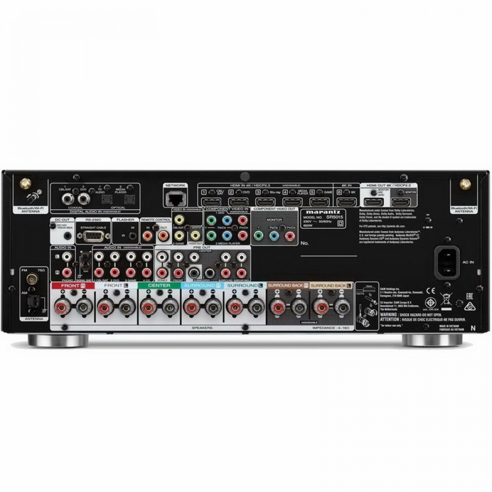 Marantz SR5015 выполнен на базе фирменных усилительных модулей HDAM, а в его звуковой части установлены 32-битнные ЦАП AK4458. В ресивере имеется шесть HDMI-входов и два выхода, которые имеют поддержку видео 8K/HDR10/Dolby Vision, а также нового возвратного аудиоканала eARC и сертификата HDCP 2.3. Среди других возможностей подключения в Marantz SR5015 можно отметить Phono-вход для MM-звукоснимателей и USB для подключения портативных носителей.